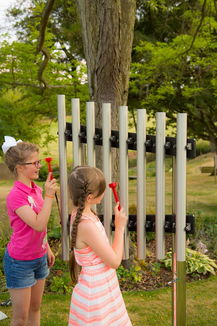 Robust Alto Diatonic Freechimes work well in various settings, including music parks, outdoor classrooms, or playgrounds. Perfect for players of every age and ability! Comfortable rubbery mallets are securely fastened to the posts by cables, so they are always ready for a quick song.
