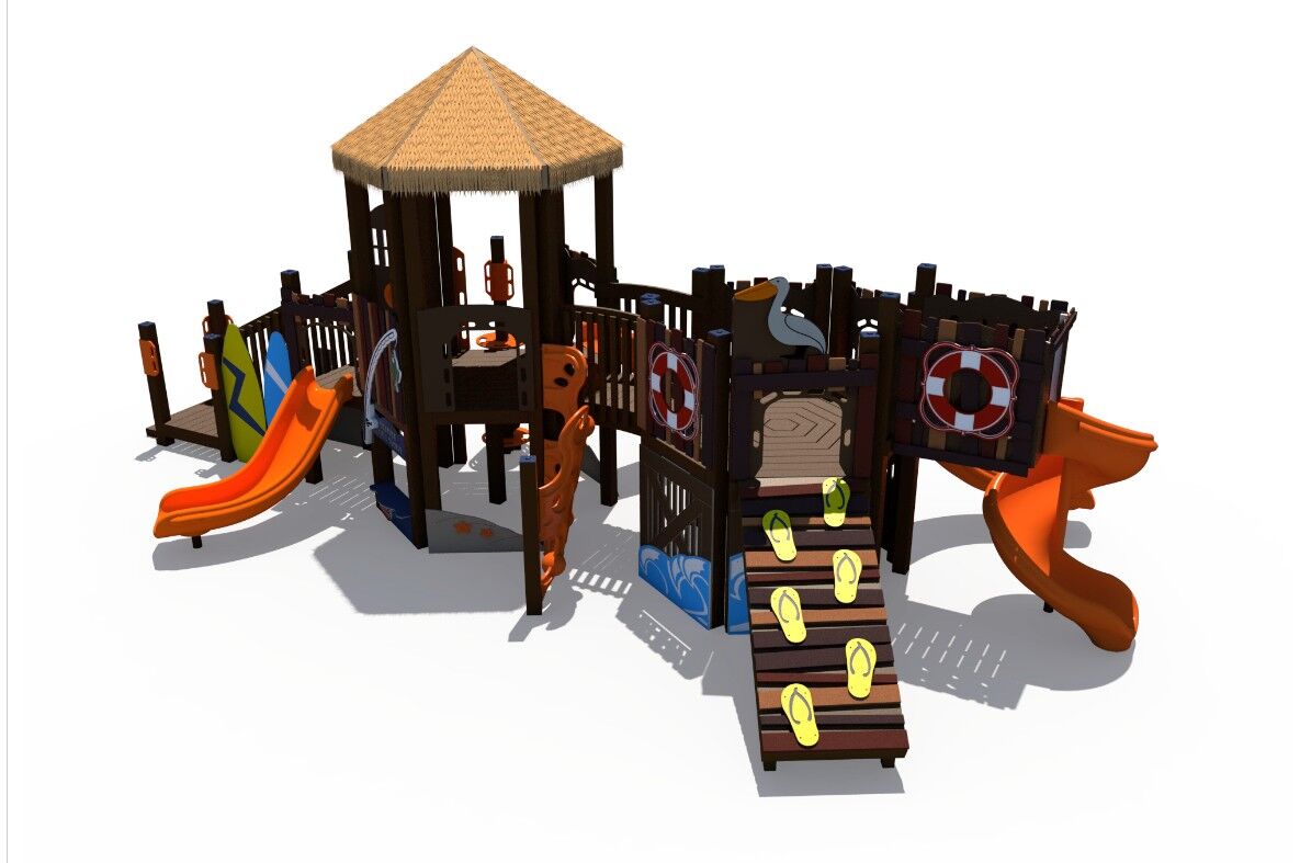 This seaside-themed play structure invites children 2-12 to take a trip to the ocean any time of day through a number of exciting panels, climbers, and slides. Accommodating up to 81 children, this playground features many recognizable sights from the ocean, including a pelican, fishing pole, and more. With a thatched roof covering the center of this play structure, children also have the option to beat the heat and relax in the shade — just like on vacation.