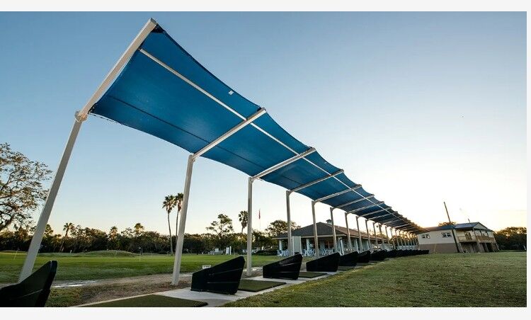 The Dugout Cantilever shade is great for dugouts, walkways, and school carpool lanes. The raised design casts a direct shadow on the area below. This easy-to-install shade shelter can also be customized with fabric panels between the columns to block wind. For design purposes, the maximum width is 14 ft. and the maximum distance between columns is 18 ft.