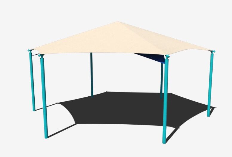 Our hexagon Sand Dollar Sail shade is a combination of a dome-style and sail-style shade structure. This commercial shade design uses a six-post design. Rather than a single fabric canopy, however, the design uses layered shade sails. This style offers great visual appeal and is appreciated by customers like landscape architects. What’s more, you can select multiple shade fabric colors to create a shade structure that is truly unique. This shade design is available in 20 ft. x 20 ft. and 28 ft. x 28 ft. sizes.