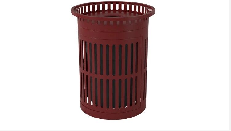 The Metro Trash Receptacle features a hinged side door for easy liner removal, along with modern vertical ribbed steel and a flared top.