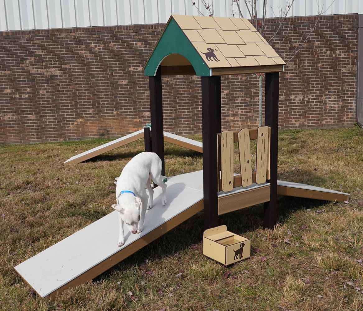 The Paw Mart™ Pup Playhouse creates a space where dogs can conquer textured ramps designed to challenge their agility or lounge comfortably on a shady deck after a playful romp.