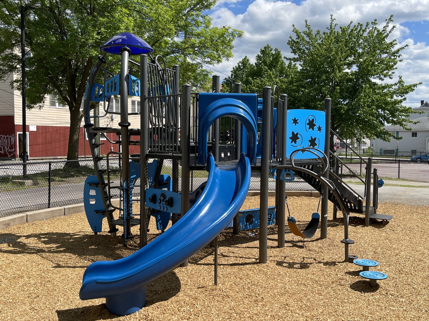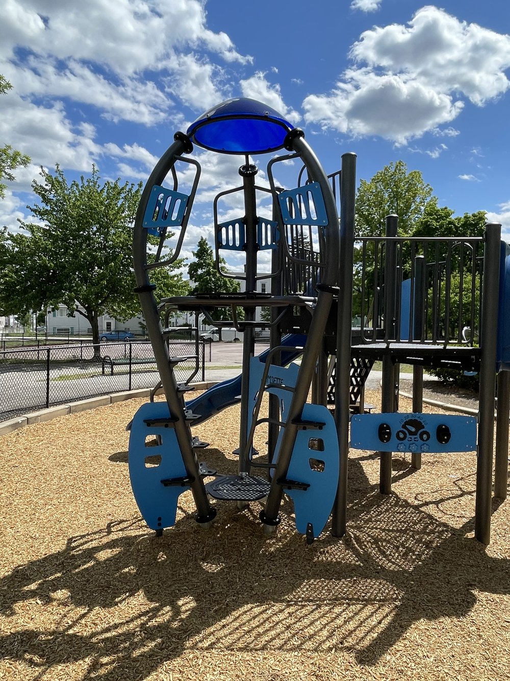 One of the many unique and creative structures from Jambette, this rocket-themed structure includes a slide, swing,climber, pods, and panels!