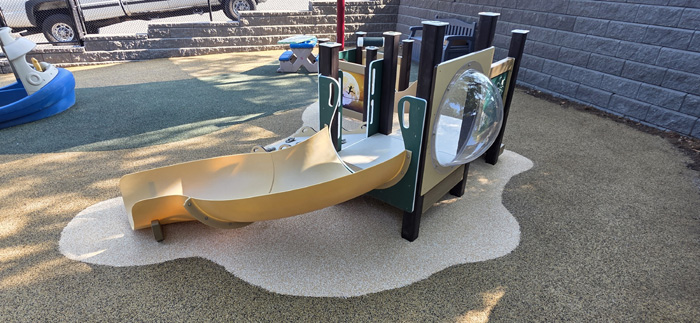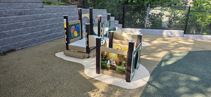 Fantasia means “a musical composition of a free form, usually incorporating several familiar themes.” This beautiful little infant playground playset is the embodiment of free-form composition, blending familiar with fantasy in equal measure. Even the footprint isn’t the typical square on this playset. There are loads of twists and turns to explore, with surprises around every corner. A marvelous mix of engraving and photo images decorate the solid panels. Youngsters can learn about animals as their fingers trace the designs. Premier Park & Play installed this whimsical structure along with the surrounding PIP safety surfacing. When thinking about safety surfacing it is important to keep in mind surface heat, especially when thinking about infants crawling around. We went with a light surface color blend of white and tan to keep the surface as cool as possible.
