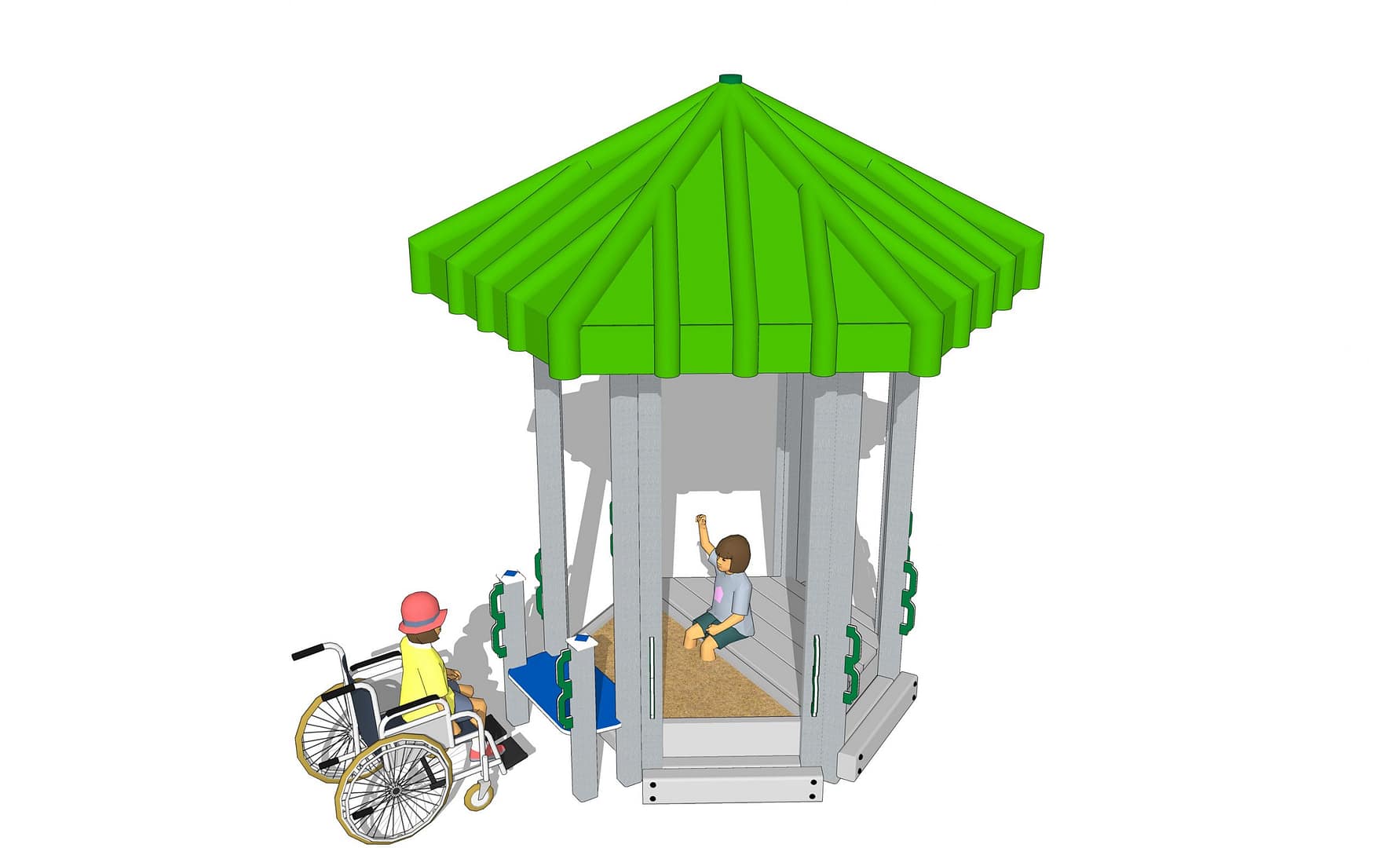 Our ADA Sand Deck is a great spot for quiet outdoor play. Half sandbox half deck, children can create a sandy construction site or share a picnic lunch on the deck. Our Hex roof provides 63 square feet of shaded comfort for both. This Sand Desk is a nice playground complement to our Sand Deck Kitchen. Ask us for ideas on how to customize your Hex set with modular pieces!