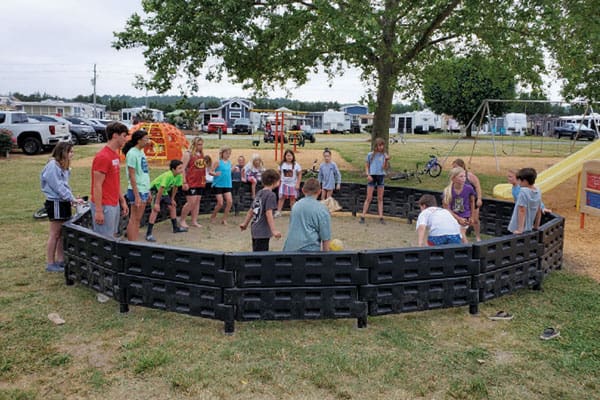 Each kit is constructed utilizing our 12″ high playground borders connected with our proprietary stanchions specifically for our GaGa Ball Pits. Additionally, Action Play Systems GaGa Ball Pits come standard with our exclusive ADA Gate for easy pit entrance and exit as well as ADA wheelchair accessibility. Once installed, our GaGa Ball Pits are 28″ high allowing for maximum ball rebound and consistent play. Our stanchions can be permanently anchored if desired (not included) and are coated for maximum durability. Additionally, our proprietary stanchion design allows each wall of the GaGa Ball Pit to be raised 4″ for easier cleaning of debris.