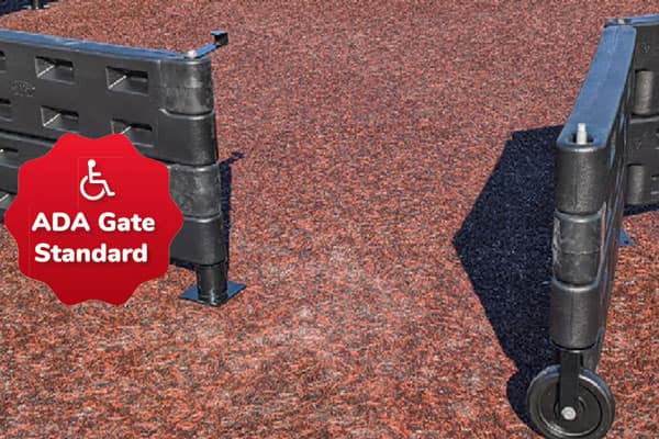 Each kit is constructed utilizing our 12″ high playground borders connected with our proprietary stanchions specifically for our GaGa Ball Pits. Additionally, Action Play Systems GaGa Ball Pits come standard with our exclusive ADA Gate for easy pit entrance and exit as well as ADA wheelchair accessibility. Once installed, our GaGa Ball Pits are 28″ high allowing for maximum ball rebound and consistent play. Our stanchions can be permanently anchored if desired (not included) and are coated for maximum durability. Additionally, our proprietary stanchion design allows each wall of the GaGa Ball Pit to be raised 4″ for easier cleaning of debris.