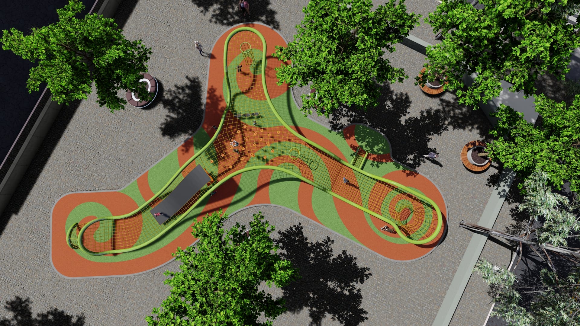 The Ascend Wave train is a fun and adventurous rope climber with a unique and modern design. This playground element has many ramp-like pieces and the netting and overall flow of the structure go gradually up and down. It has both a bridge-like entrance and a basketball hoop-like entrance as well for children to either climb or run around.