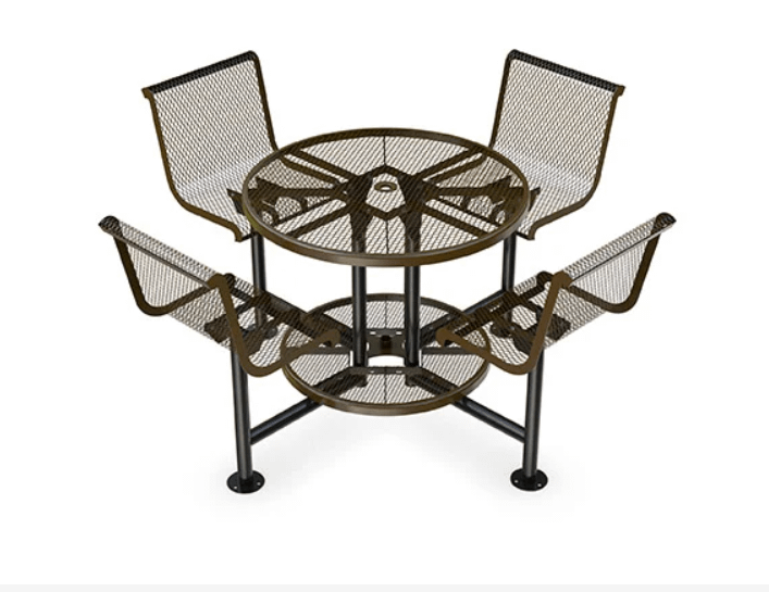 Create a stylish outdoor dining space with our bar height patio table with attached chairs. This unique outdoor restaurant table has many great features including our popular UltraLeisure metal design, 4 attached bar height metal chairs, footrests, and an umbrella hole.