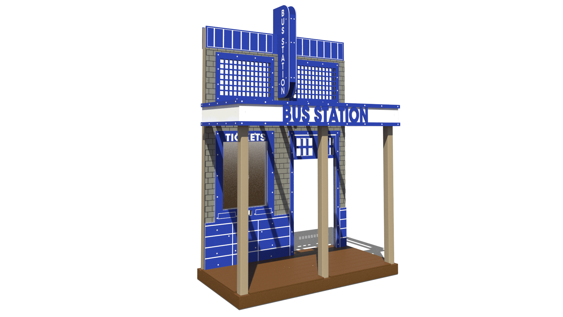 The bus station is the perfect addition to any playground. The bus station has a ticket booth to allow children to participate in interactive imaginative play. This play structure is ideal for children ages 2-12 years and perfect for small and large play areas.