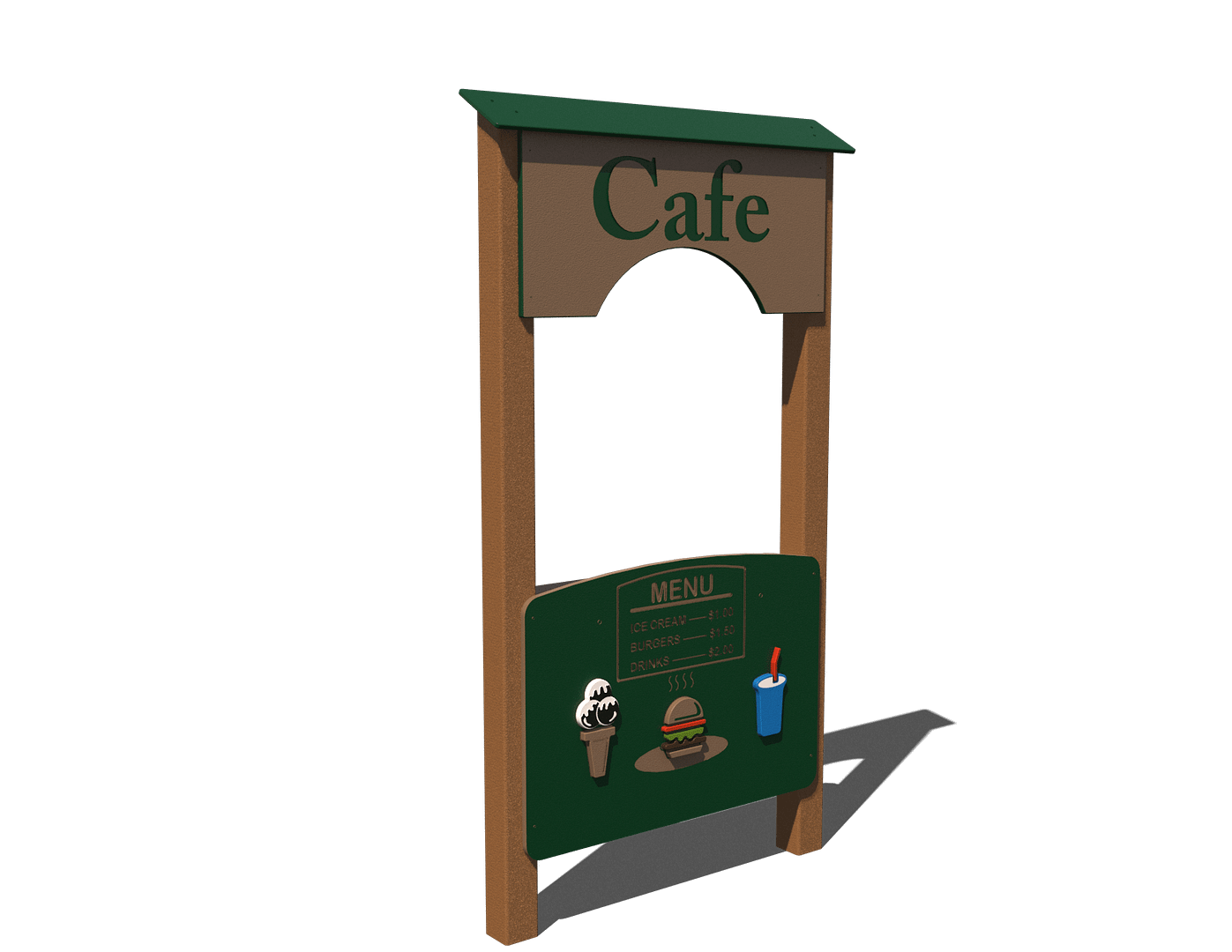 “We have juice, lemonade, and water. That will be fifty cents, please!” Involve children with language, communication, and even economics with our dramatic play Café Stand! This fun play panel with menu allows those on trikes to ride up and order on the go. Pretend play is a worthwhile addition to any playground as it helps children develop social skills.