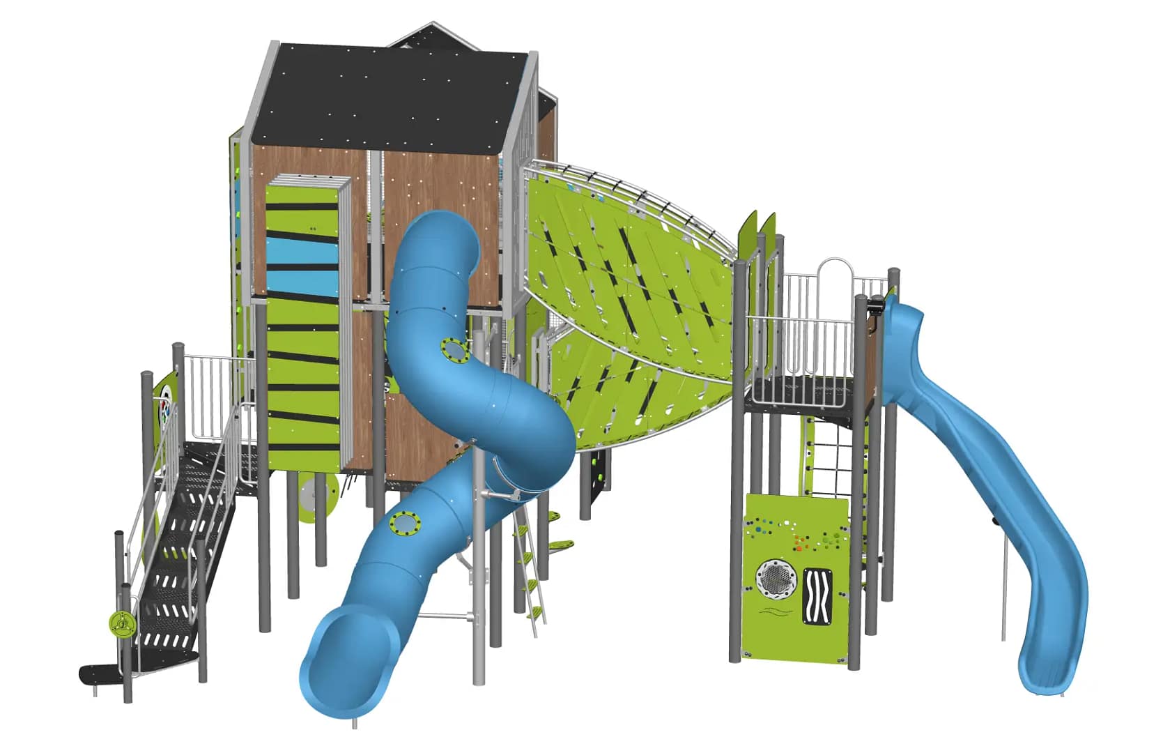CitipleX is a scalable and inclusive urban play module that includes accessories and games right inside and under its platforms for people with reduced mobility. Climb its interior walls, get through the labyrinth game, hurtle down its slopes and hop on its massive slide. Discover its unique spaces, some of which are dynamic with exciting games integrated into its structure, and others that are more chill with airy spaces and a spectacular view of the surrounding area.