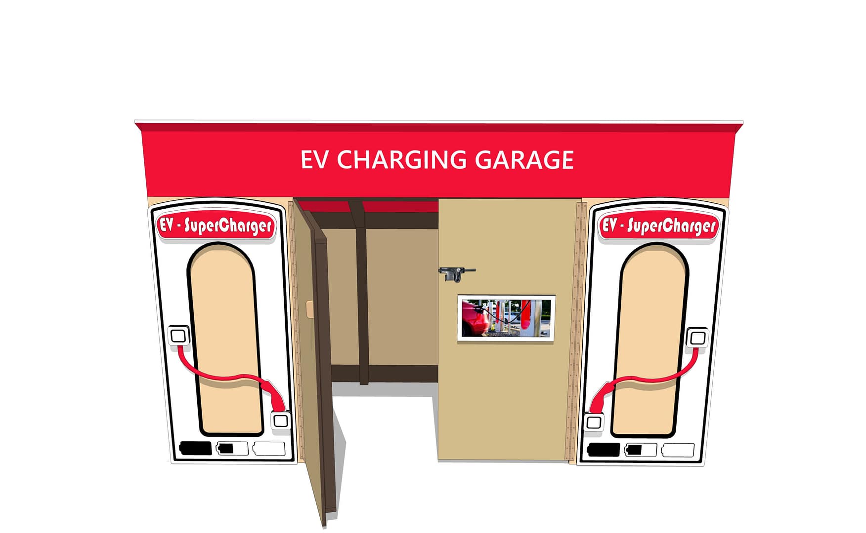 Encourage awareness of the environment with our new EV Charging Garage Trike Play playhouse! The trend from fossil-fueled vehicles to electric vehicles has increased in recent years. In the future, we may see banks of charging stations near the corner store.