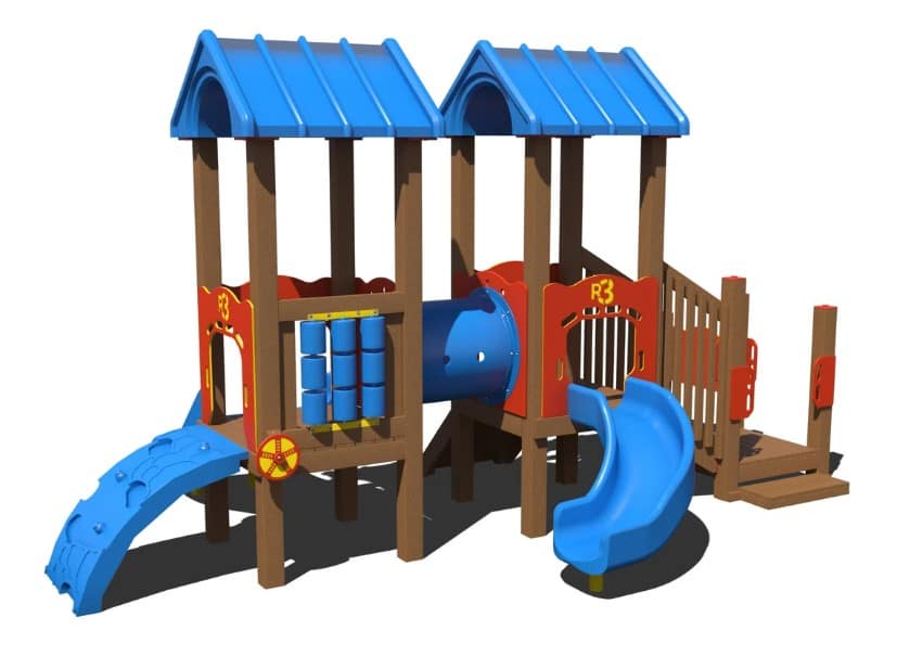 Since it is made from recycled materials, the look of this structure is a more natural one. The decks and posts are made from 100 percent recycled post-consumer plastic products and are available in three different colors: cedar, dark brown, and gray (at an upcharge). The other parts of the structure come in a variety of colors. Key features of this product include an animal spinner panel and steering wheel, a bedrock climber, an inclined climbing ramp, a 36-inch crawl tunnel, and much more!