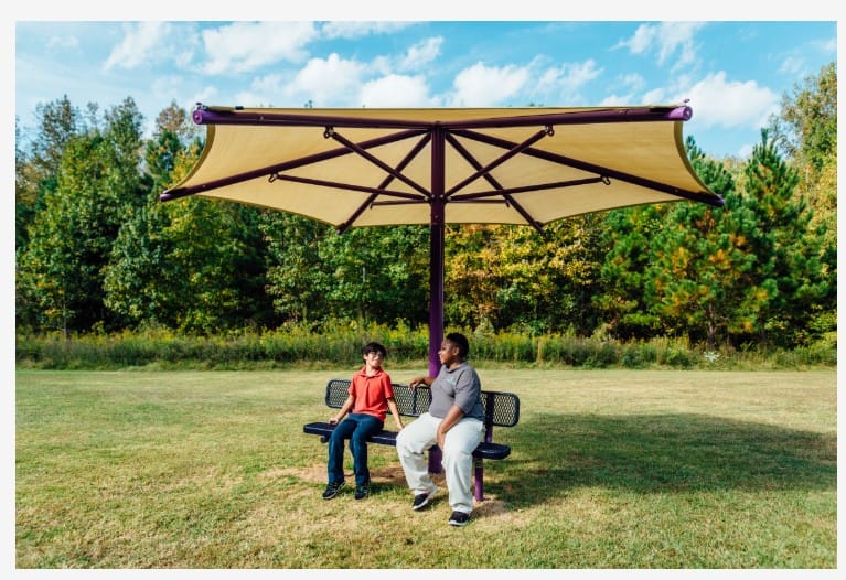 Our hexagon outdoor umbrellas are a perfect upgrade to existing dining, patio, or play spaces. This shade style is popular with restaurants for their al fresco dining areas. Additionally, it is popular with daycare centers, churches, and preschools where children need a break from the sun. With its single post, this commercial umbrella gives a lot of shade without the interference of a lot of posts.