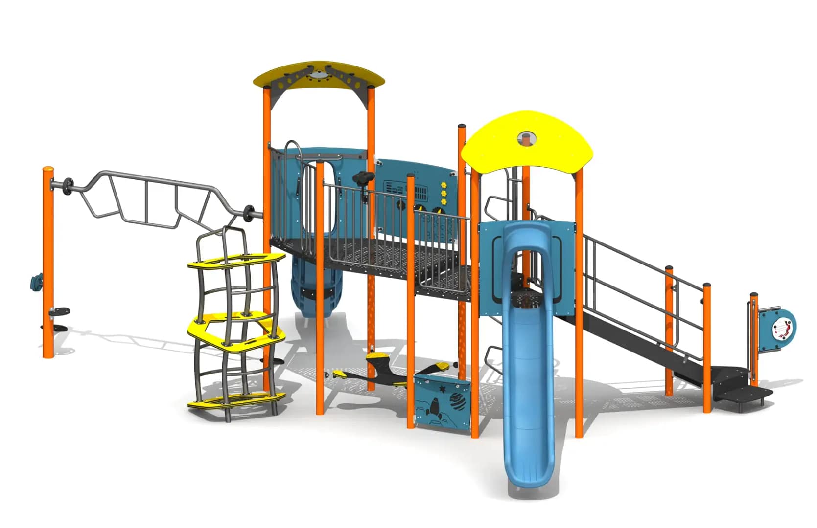 This playground features a vibrant, multi-level structure with a blue enclosed slide, a curved climbing net with bright yellow platforms, and an overhead climber for upper-body strength. Elevated walkways connect the elements, while a ramp with railings enhances accessibility. Interactive panels and decorative designs promote imaginative play, and orange supports add visual contrast. The structure provides a balance of physical challenges and creative activities for a well-rounded play experience.