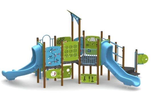 The image shows a playground structure designed for children aged 18 months to 5 years, offering a variety of features to support physical and cognitive development. It includes two slides, multiple climbing panels, and a bridge for balance and coordination. Interactive play panels with shapes, patterns, and tactile elements encourage sensory exploration and problem-solving. The structure is supported by sturdy posts and features accessible entry points, making it inclusive for younger children. It provides opportunities for climbing, sliding, and imaginative play, making it ideal for early childhood development.