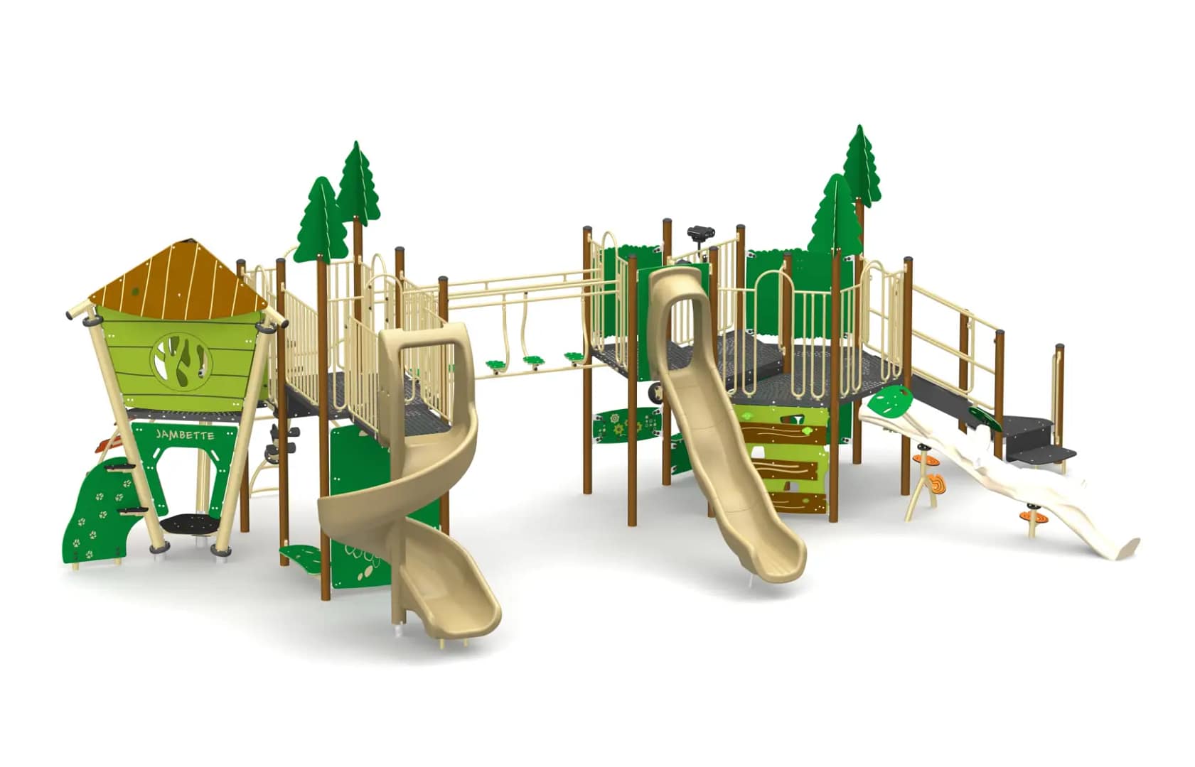 Taking nature play to the next level with themed pine tree toppers and a playhouse this stucture is spread out which allows for various play areas within the same structure.