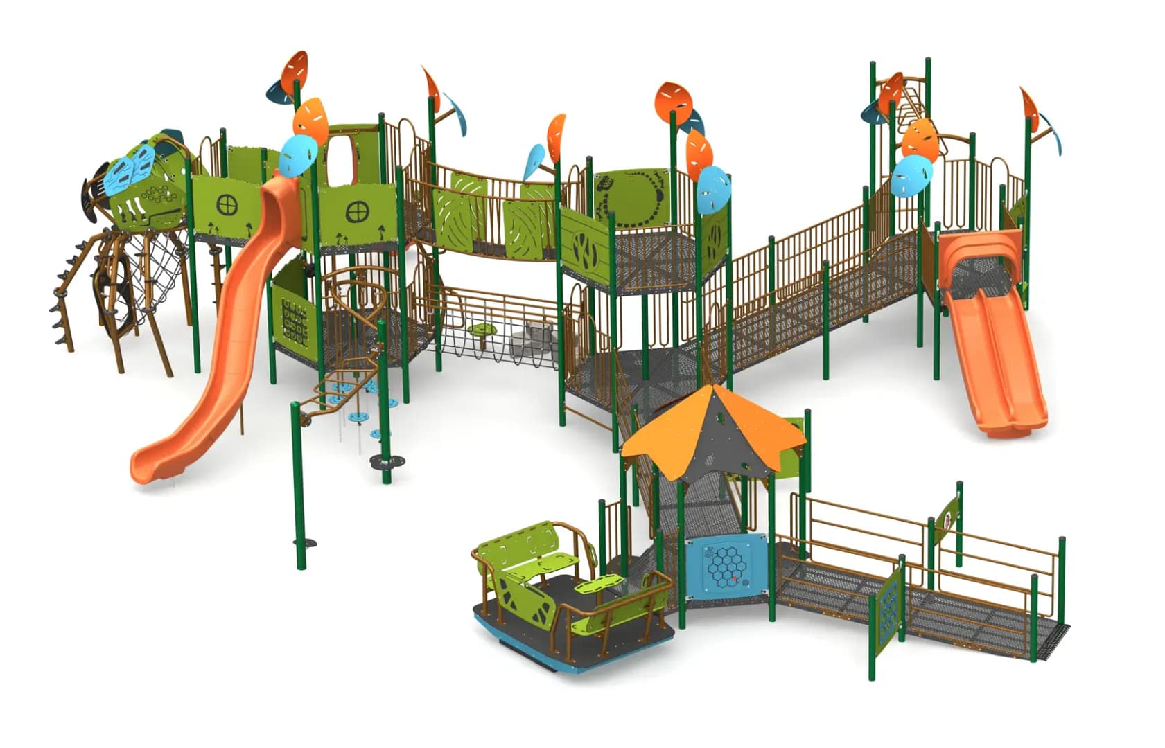 This large accessible structure is fully ramped allowing total inclusivity out on the playground. Each platform hosts a variety of panels, challenges and activities for all everyone!