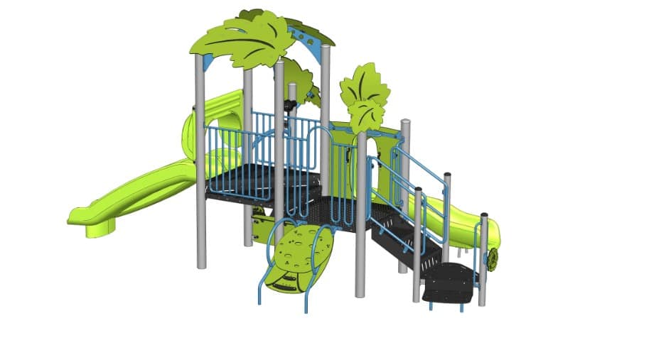 This NEW structure from Jambette features a leaf canopy designed to provide shade to the decks of the structure as well as provide eye-appeal to the structure. With a unique belly swing it provides sensory play for children ages 18 month- 5 years.