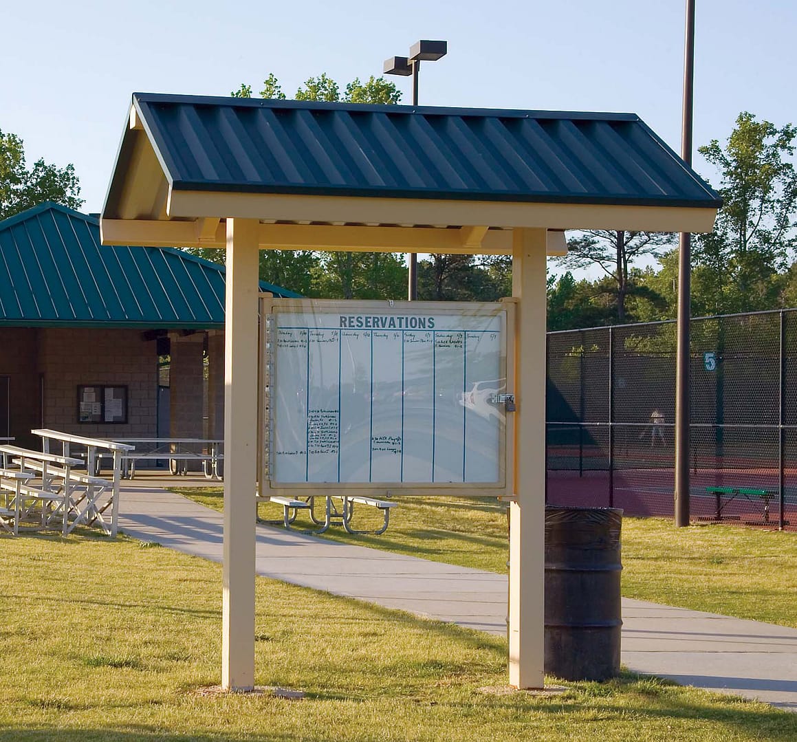 Many of our shade structures can be scaled down and converted into kiosks. The standard kiosk shade shelter is supplied with an HR-36 steel roof and a 3/4″ unfinished, marine grade plywood information board. Hinged and locking vandal resistant aluminum cabinets are available, along with a variety of roofs and powder coatings for the frame. Several of the displays or cabinets shown are provided by the owners. Kiosks are measured eave to eave or point to point, with the exception of the Charleston kiosk, which is measured outside to outside of columns.
