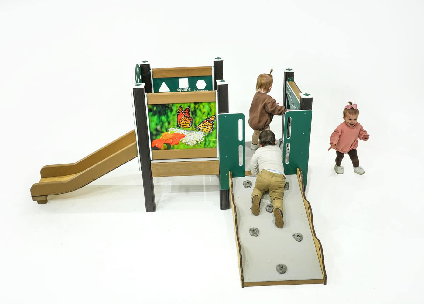 Young children need play equipment to match their proportions, and this beautiful Monarch outdoor playset is perfectly sized! Tots can scramble up the gentle slope of the Rocky Ramp Climber to reach the low decks.