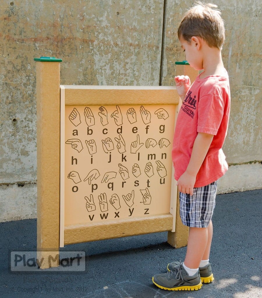 Our Sign Language Panel gives kids an opportunity to learn sign language on the playground. The freestanding Sign Language Panel can be installed in-ground or with a portable base. This panel will foster communication among children of all abilities in your play area.
