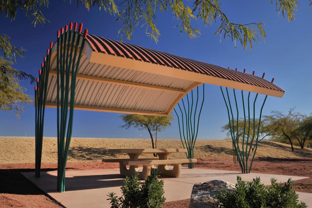 Classic Recreation’s one-of-a-kind southwestern-style Ocotillo shade structure model features a corrugated, curved steel roof and 14 rebar support “canes” (1 1/2″). It is available any size, in square or rectangle. It is offered with corrugated or HR-36 and Super Span steel roofs.