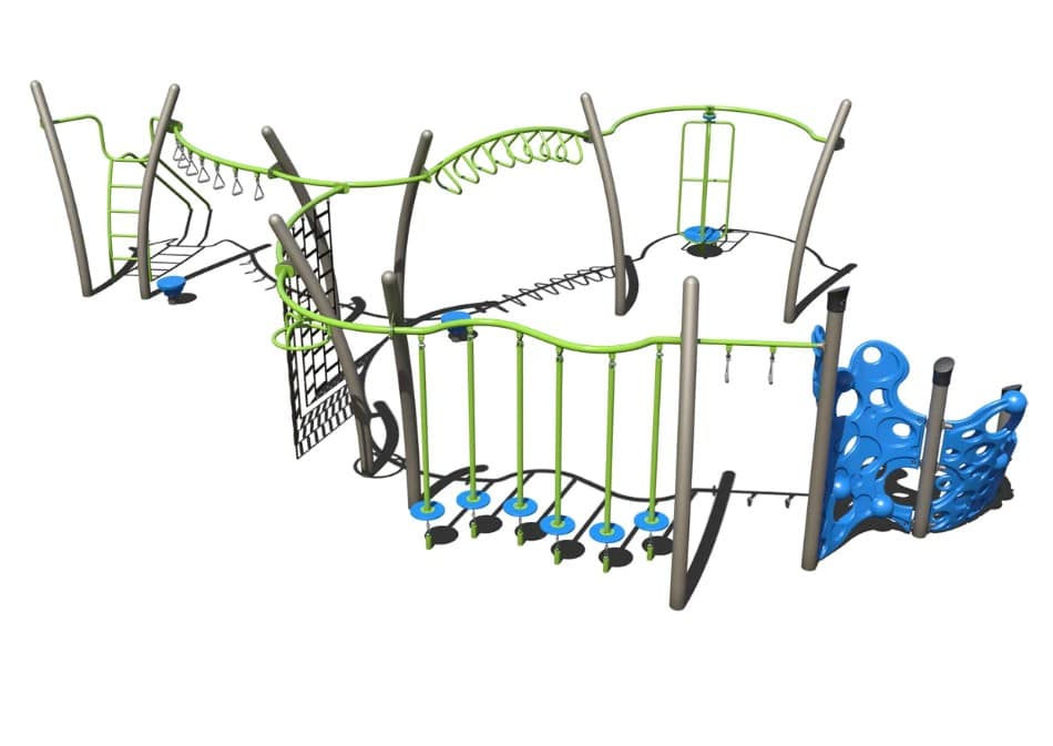 Our PA5-29718 is an ideal commercial playground for an elementary school looking to create an obstacle course-like challenge for their students aged 5-12. Children will go from activity to activity as they weave their way through the Lily Pad Bridge, swing on our Wheel Swinger, and make their way to our Chain Climbing Wall. This piece of elementary school playground equipment is available in your choice of colors and can accommodate up to 20 students.