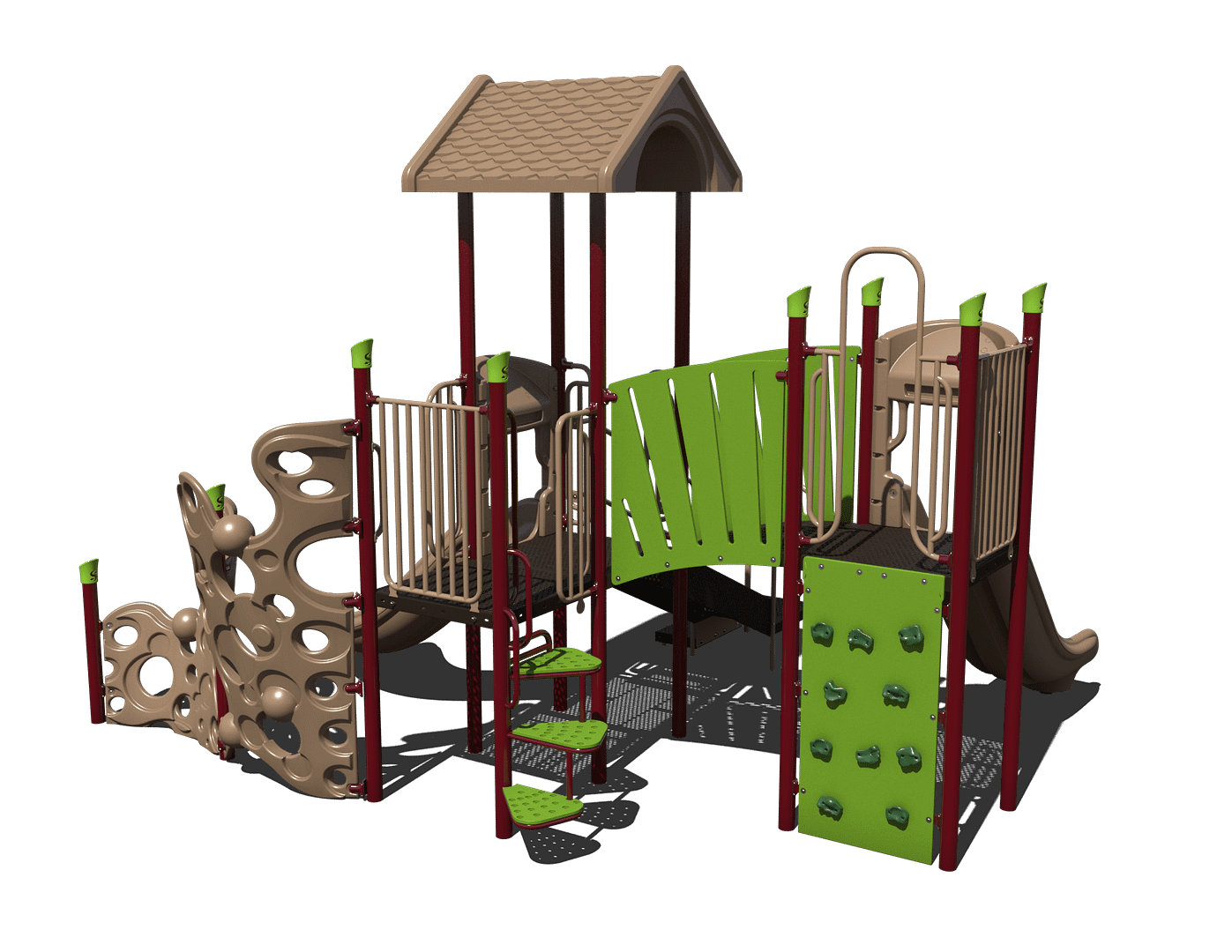 The age-appropriate activities on the PS3-31905 steel structure are for children 2 to 12 years old. It has a required use zone of 30′ x 30′.