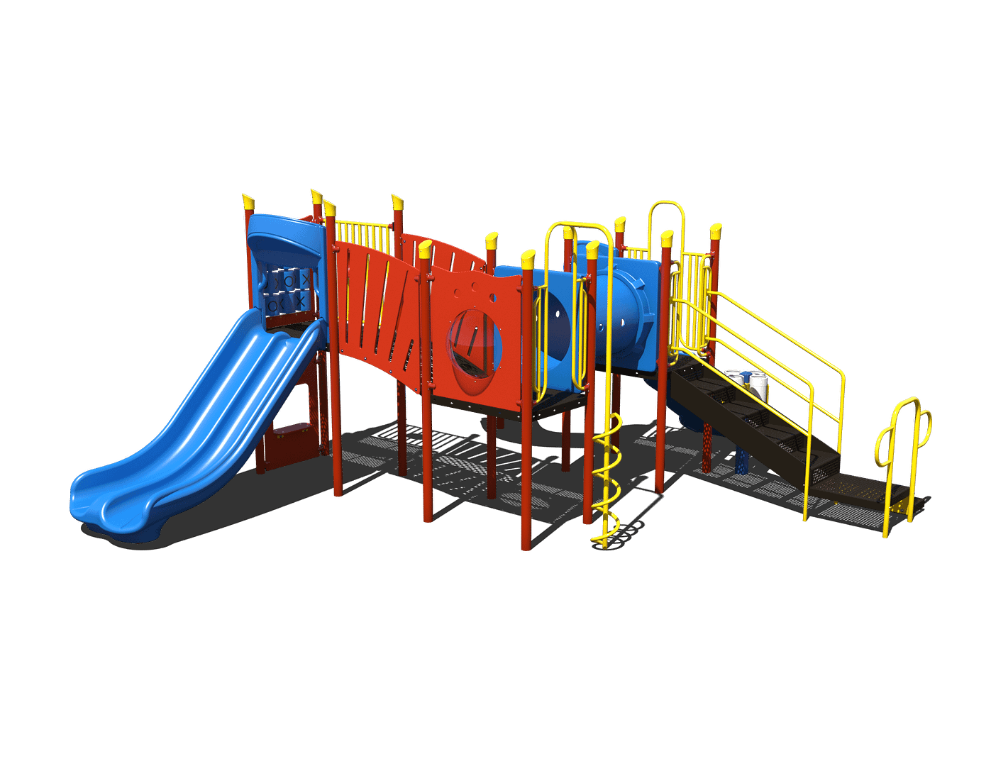 The PS3-33275 is a commercial playground structure designed for school-aged children from 2-5 years of age. This play structure offers plenty of physical exercise and social engagement elements. The unit has a coil climber, a bubble panel, bongo drums, and multiple slides. Choose from many color combinations with this play unit.