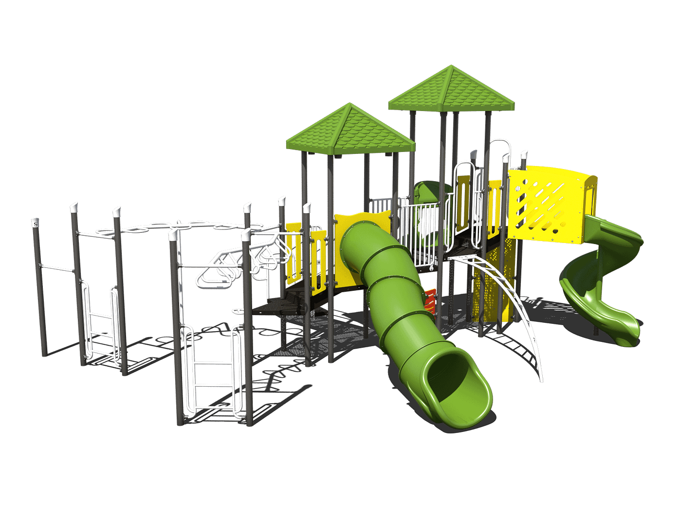 Our PS3-71010 is a mid-size playground designed for school-age children. This playground boasts our two most popular slides, the tube slide and spiral slide, as well a curved chute slide. What’s more, this school playground design features two overhead ladders to encourage upper body strength development, along with multiple climbers that allow for gross motor skill and hand-eye coordination development.