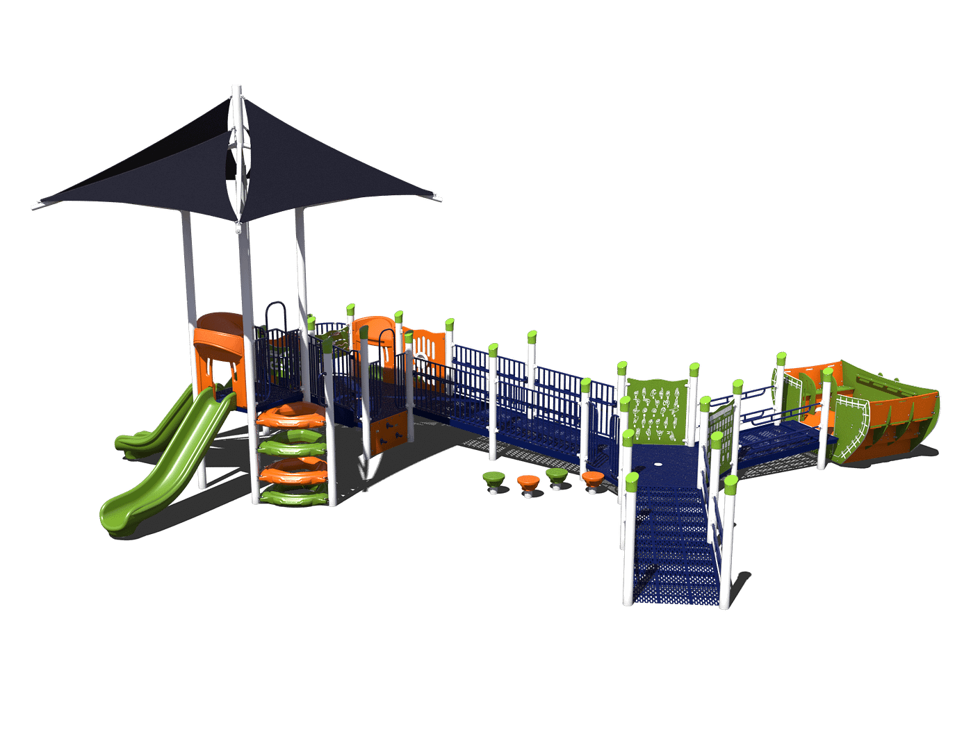 “Our PS5-71105 features a wide ramp throughout as well as multiple play events that children of all abilities can access. While there are climbers, slides, and play panels on this structure, the most notable component is our integrated Rockin’ Glide! It features seating for six plus one mobility device.