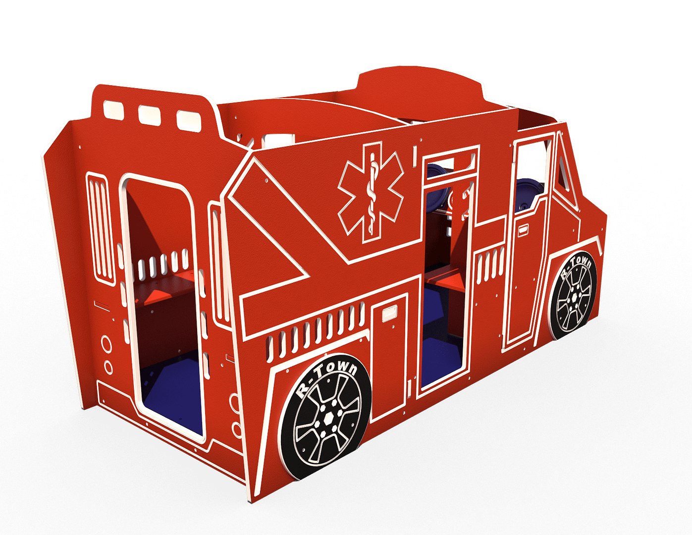 The R-Town® Ambulance creates a fun outdoor environment for children to interact in imaginative play. The structure is also equipped with two steering wheels.