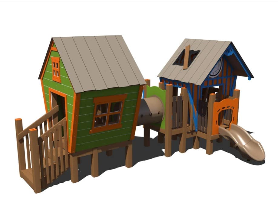 The RFX-30187 is part of our collection of R-Town Cottages. This playground features two whimsical cottages connected with a crawl tunnel. Children ages 2-5 will love exploring the fun slides, climbers, and interactive play panels on this play structure.