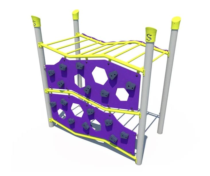 The Rockface Climber is a freestanding playground climber that is designed with an overhead ladder with an attached rock wall.