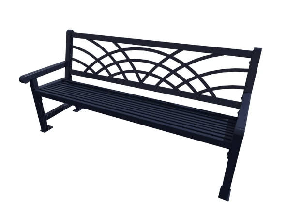 The Samoa Bench with Back features a designed backrest reminiscent of a rising sun.