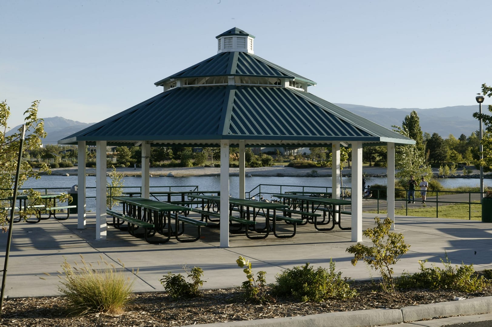 This stylish octagon shade shelter is available in a variety of sizes with two or three roof tiers and/or a New-England-style cupola. Ornamentation and railings are also available. The Savannah shade structure model is particularly pleasing as a central focal point in a park and makes a great band pavilion.