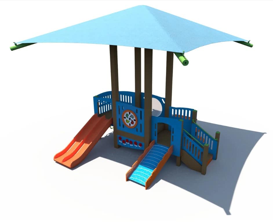 Our eco-friendly playground for ages 6-23 months fosters early skills with a slide, climber, interactive panels, and a toddler table — all under a large shade.