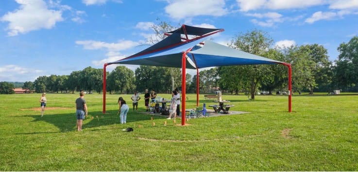 Our square Pinwheel Sail shade has a similar framework to our standard hip designs but the fabric of our sail shade designs. This commercial shade structure features four layered triangular sails and a square sail. The layered design offers great visual appeal and sun protection. What’s more, you can choose more than one fabric color. Our square Pinwheel Sail is available in three standard sizes. Any design over 20 ft. will require a sail fan.