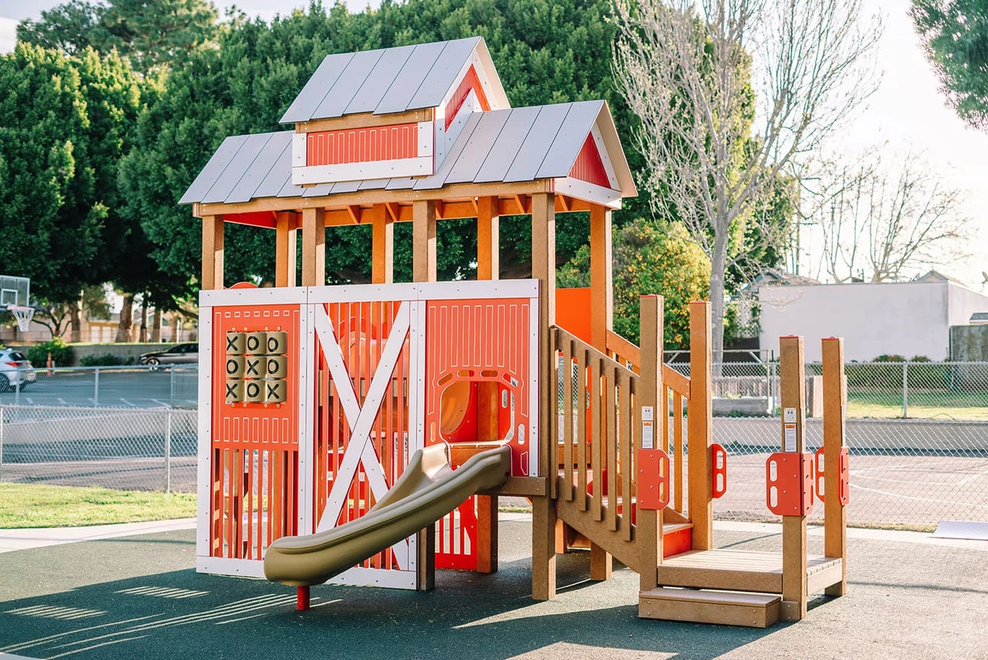 Younger children can easily identify the design of this recycled playground, taking an imaginary trip to the farm and enjoying hours of enjoyment with this structure’s many fun features. Pre-schoolers have three ways to reach the top of this play structure: by using the ADA transfer station, an inclined plank climber, or bedrock climber. Once on the playground, they can enjoy a triple rail slide, crawl tunnel, 90-degree slide, and a tic-tac-toe panel. The below deck portion of this outdoor playground is partially enclosed in slotted barn side panels to feel like the inside of barn and the upper deck is covered by a barn roof, giving children plenty of shade.