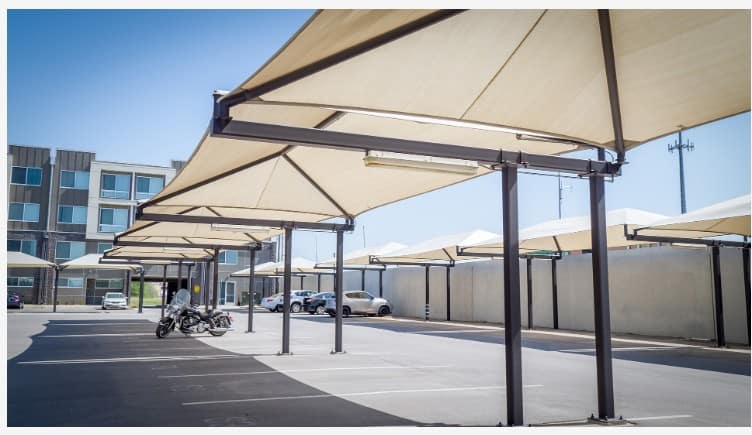 The Standard Cantilever is a great solution for shading walkways, bleachers, and bus stop seating. Because the columns are on one side of the shade, the Standard Cantilever is also a good option for shading vehicles. What’s more, this style is one of the most economical ways of shading cars and parking lots. With this shade being so versatile, you can’t go wrong selecting it for your shade needs. Some common sizes include 18’x20′, 18’x27′, and 18’x36′.