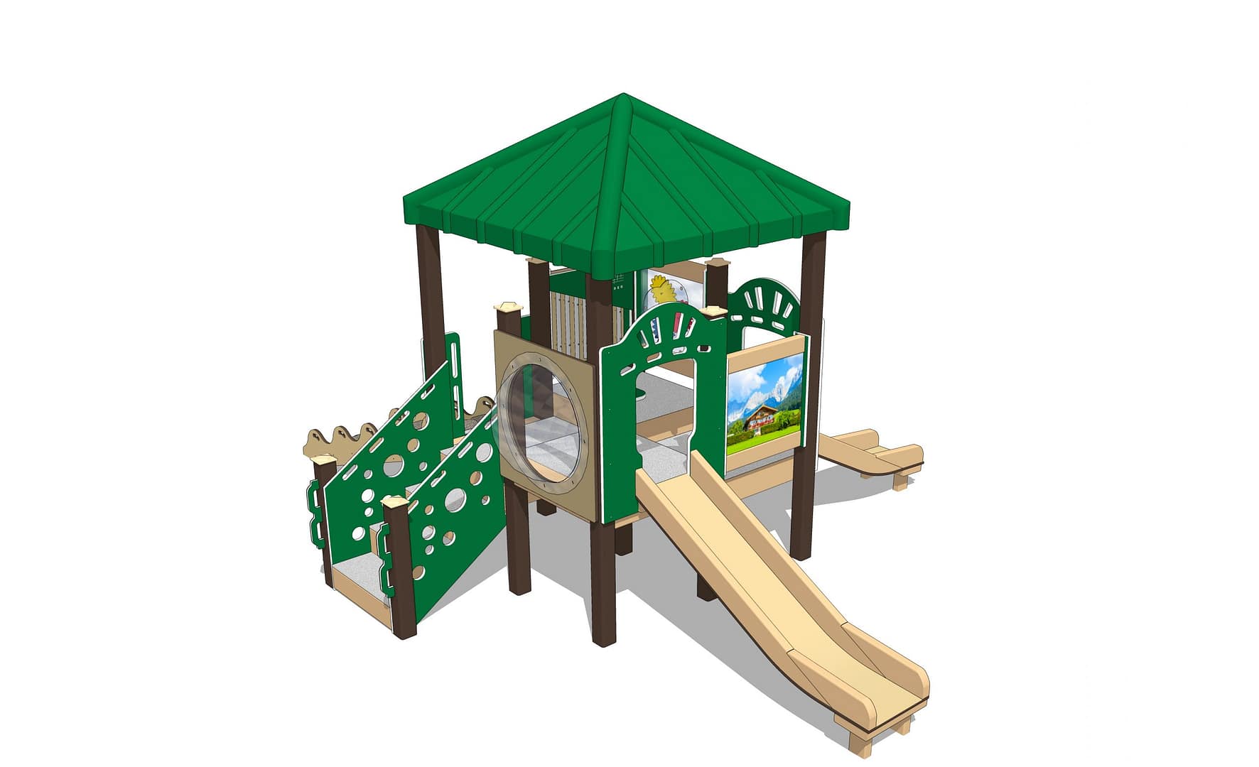 Our Nature of Early Play Swiss Chalet playset was created just for infants, from 6 months to 23 months! This playground playset features our new Infant Rocky Ramp with Handrails, new Infant Slide, new Cheesy Stairway, new Infant Chickadee Chime panel, and our Casa Grande Roof. Perfect for little ones to climb, explore and play.