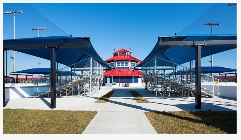 Keep the interference of posts to a minimum with the T-Cantilever shade. The T-Cantilever style shade is so versatile it can be installed everywhere from parking lots to sports parks — it can keep the cars in your parking lot or the fans at your sports park cool.