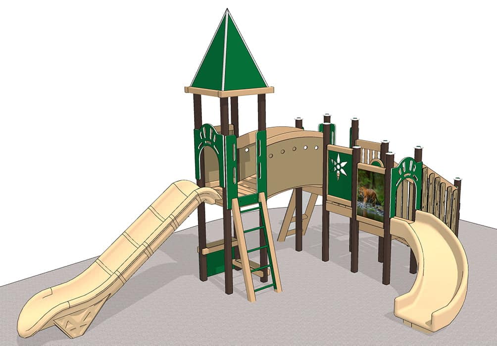 Children can safely play in the wild jungle on this Tiger themed playset part of our Mini series designed to fit smaller play areas. The namesake of this beautiful playset looks out from two vivid full-color photo panels. Animal lovers are sure to appreciate the majestic cat’s watchful gaze.