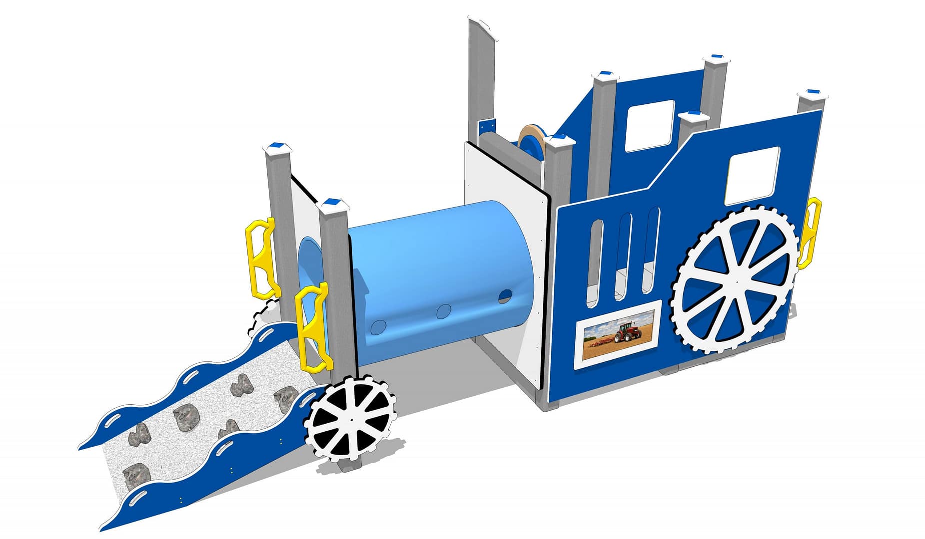 A quick scamper up the Rocky Ramp takes youngsters to the Peek-a-Boo Tunnel. The realistic steering wheel awaits at the other end. Cutouts in the side panels give tots a clear view of their surroundings. Large HDPE wheels add the perfect touch of whimsy for pretend play.