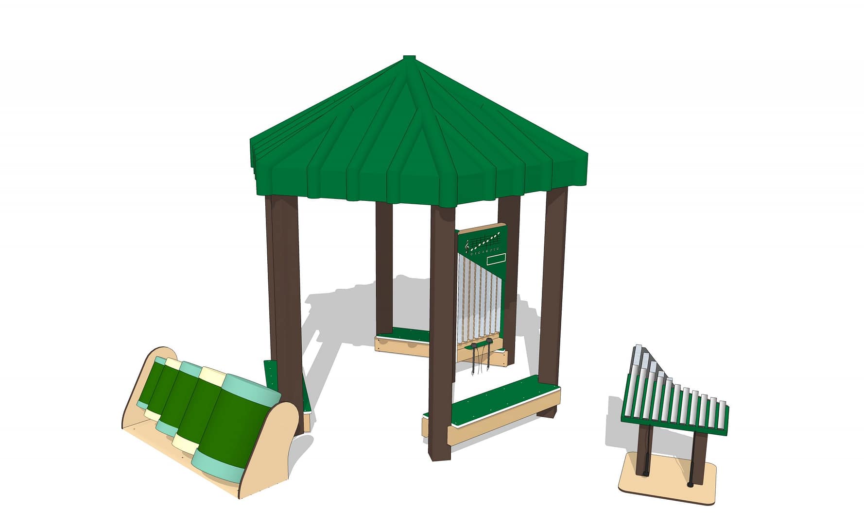 The Wee Jammin’ Gazebo sports a hexagon roof to shelter playground jam sessions. The Nature of Early Play Wee Jammin’ Gazebo includes three attached benches, Mini Chime Panel, Tuned Drums on Stand, and Merry Weenote instrument. Hex Gazebo is also available with 3 Benches. Bring music and shelter to your children’s play area.