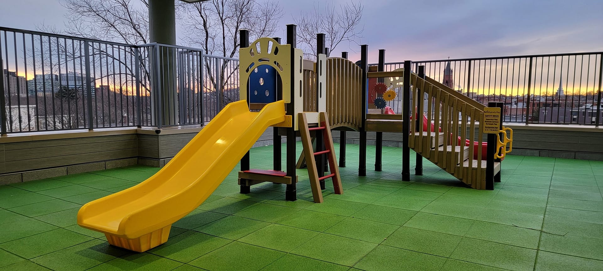 This brightly colored early childhood playground was provided by supplier Natures of Early Play, which also includes a spacious play hut.