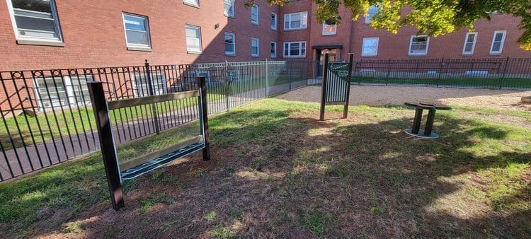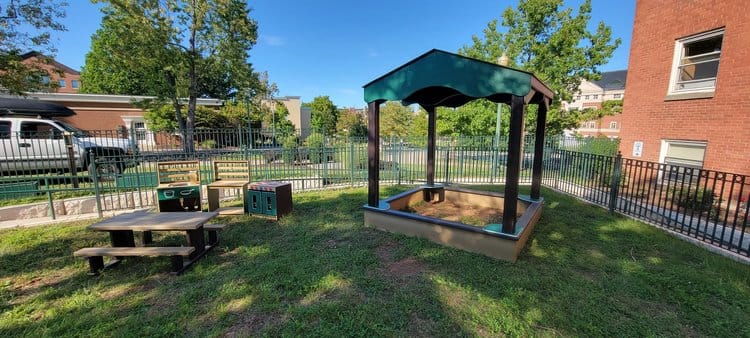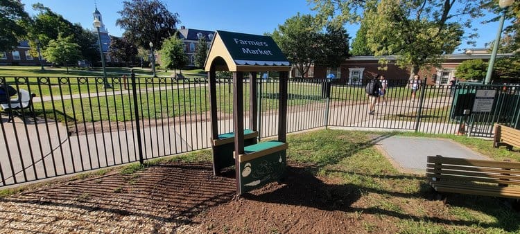 This playground’s equipment is all from Nature of Early Play, including: Mud Kitchen, Picnic Table, Covered Sandbox, Easel, Music Equipment, Kids Kabin and raised Garden Beds