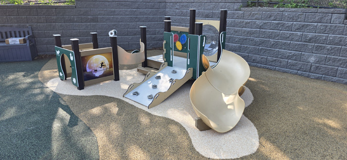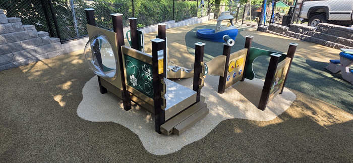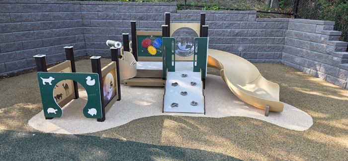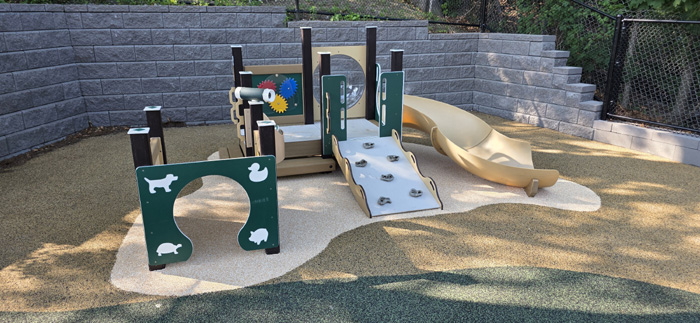 Fantasia means “a musical composition of a free form, usually incorporating several familiar themes.” This beautiful little infant playground playset is the embodiment of free-form composition, blending familiar with fantasy in equal measure. Even the footprint isn’t the typical square on this playset. There are loads of twists and turns to explore, with surprises around every corner. A marvelous mix of engraving and photo images decorate the solid panels. Youngsters can learn about animals as their fingers trace the designs. Premier Park & Play installed this whimsical structure along with the surrounding PIP safety surfacing. When thinking about safety surfacing it is important to keep in mind surface heat, especially when thinking about infants crawling around. We went with a light surface color blend of white and tan to keep the surface as cool as possible.